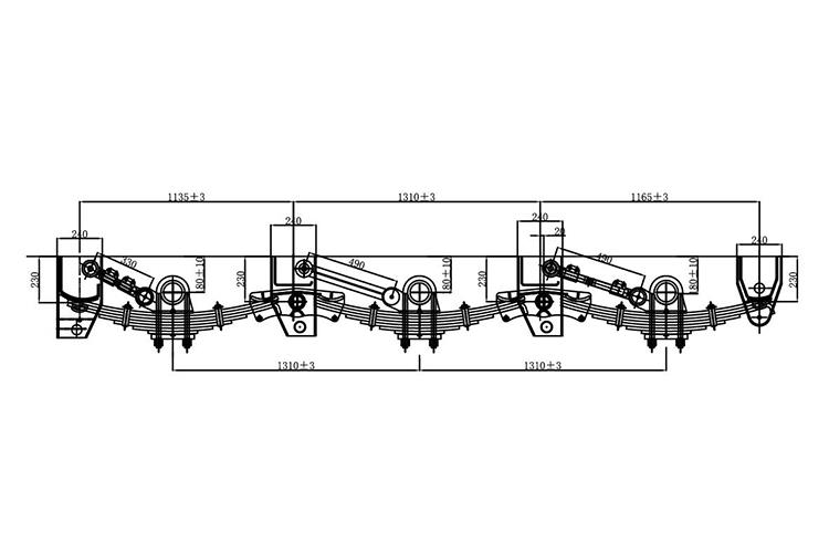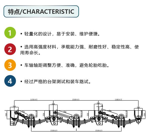 美式反装圆桥悬挂特点:1、轻量化的设计,易于安装、维护便捷。2、选用高强度材料,承载能力强、耐磨性好、稳定性高、使用寿命长。3、车轴轴距调整方便、准确,避免轮胎吃胎。4、经过严格的台架测试和装车路试。