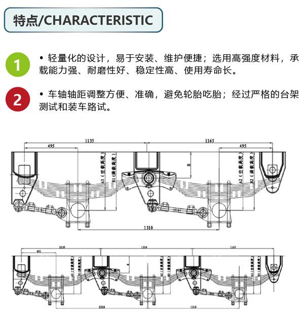 美式正装圆桥悬挂特点:1、轻量化的设计,易于安装、维护便捷;选用高强度材料,承载能力强、耐磨性好、稳定性高、使用寿命长。2、车轴轴距调整方便、准确,避免轮胎吃胎;经过严格的台架测试和装车路试。