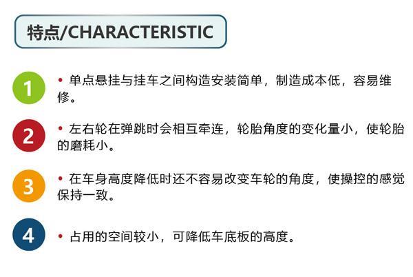 2、左右轮在弹跳时会相互牵连,轮胎角度的变化量小,使轮胎的磨耗小。